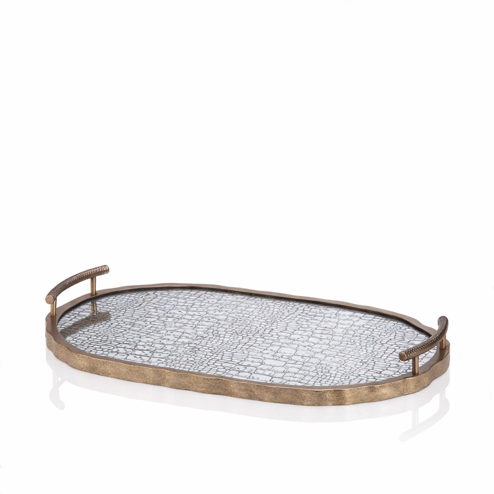 Χειροποίητος οβάλ δίσκος γάμου με επιφάνεια καθρέπτη με print με σκούρες ασημί λεπτομέρειες και χερούλια από luminex resin της Authentique Art.