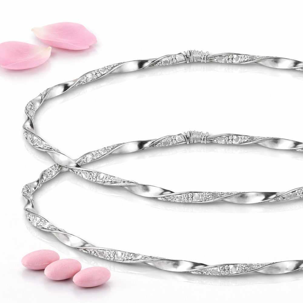Δώστε στον γάμο σας την αίσθηση πολυτέλειας που του αξίζει. Αυτά τα χειροποίητα επάργυρα στέφανα ξεχωρίζουν για την κομψή πλέξη δύο βεργών, δημιουργώντας ένα εντυπωσιακό αποτέλεσμα υψηλής αισθητικής.