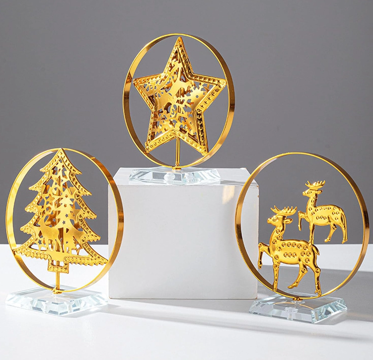 Κομψά μεταλλικά στολίδια σε τρία σχέδια (Ελάφι, Αστέρι, Δέντρο), κατασκευασμένα με προσεγμένη λεπτομέρεια.
