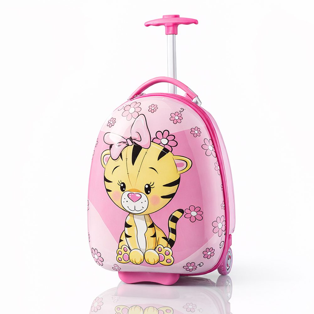 Παιδική βαλίτσα καμπίνας σε ροζ χρώμα με τυπωμένο σχέδιο τιγράκι. Διαθέτει σκληρή και ανθεκτική κατασκευή και είναι ιδανική για χρήση ως χειραποσκευή καμπίνας σε ταξίδια.