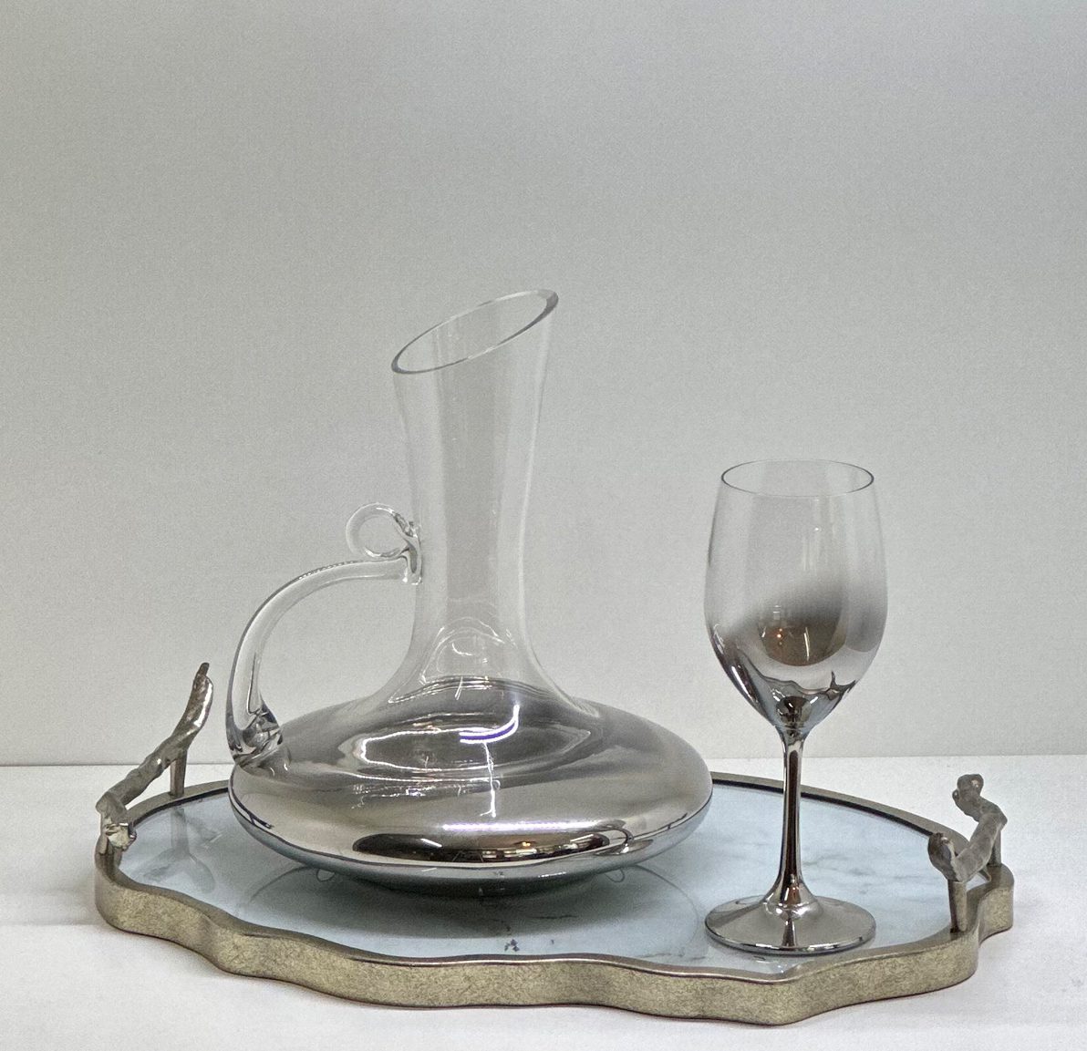 Μία καράφα και ένα ποτήρι κρασιού κρυστάλλινα με ασημένια επένδυση