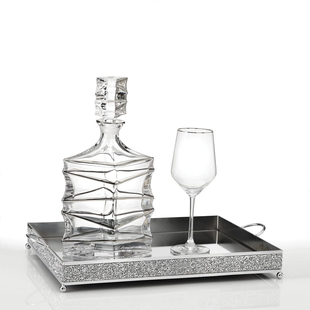 Ορθογώνιο ασημένιο δίσκο με καθρέπτη και περίγραμμα από ασημένια στρασάκια, διαστάσεων (40x30x7cm), ιδανικό για το μυστήριο και τη διακόσμηση.