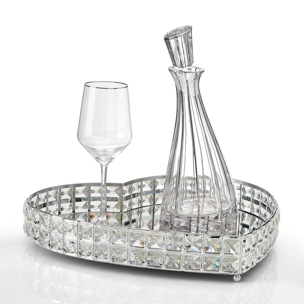 Ασημένιο δίσκο σε σχήμα καρδιάς με καθρέπτη και περίγραμμα διακοσμημένο με κρύσταλλα, διαστάσεων (35x40x7cm), ιδανικό για το μυστήριο και τη διακόσμηση.